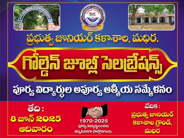 ప్రభుత్వ జూనియర్ కళాశాల మధిర 1970 నుండి 2024 వరకు చదివిన మిత్రులారా జూన్ 8వ తారీఖు నాడు సర్వోత్సవాలు వేడుకలు జరుపుటకు పూర్వ విద్యార్థుల అందరము.